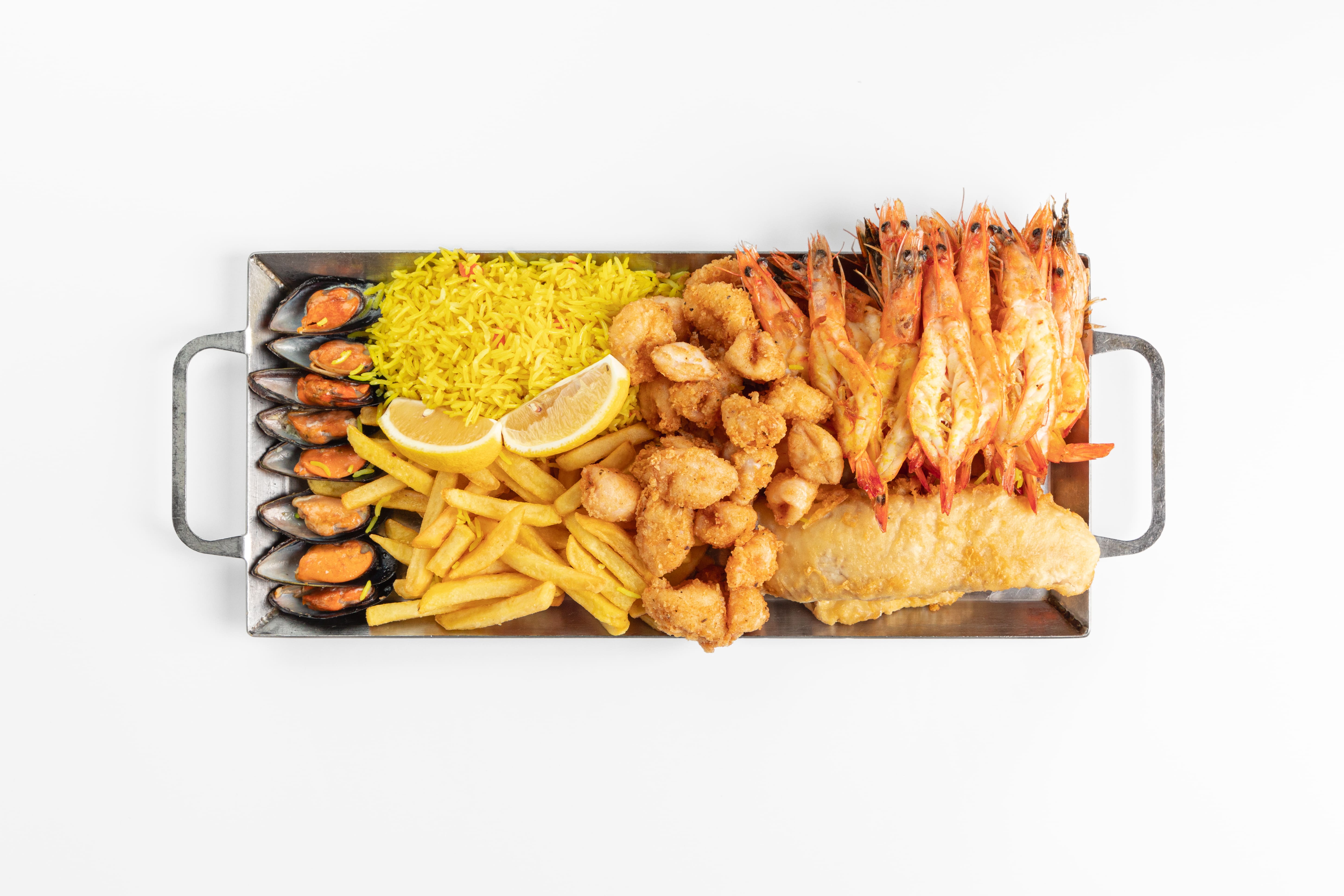 Платтер из креветок prince баттерфляй на гриле (24 шт.), рыбы дня (300 г в сыром виде), нежных кальмаров (200 г в сыром виде) и чилийского сорта мидий (8 шт). Подается с двумя гарнирами на выбор. Рассчитан примерно на 4-5 персон
