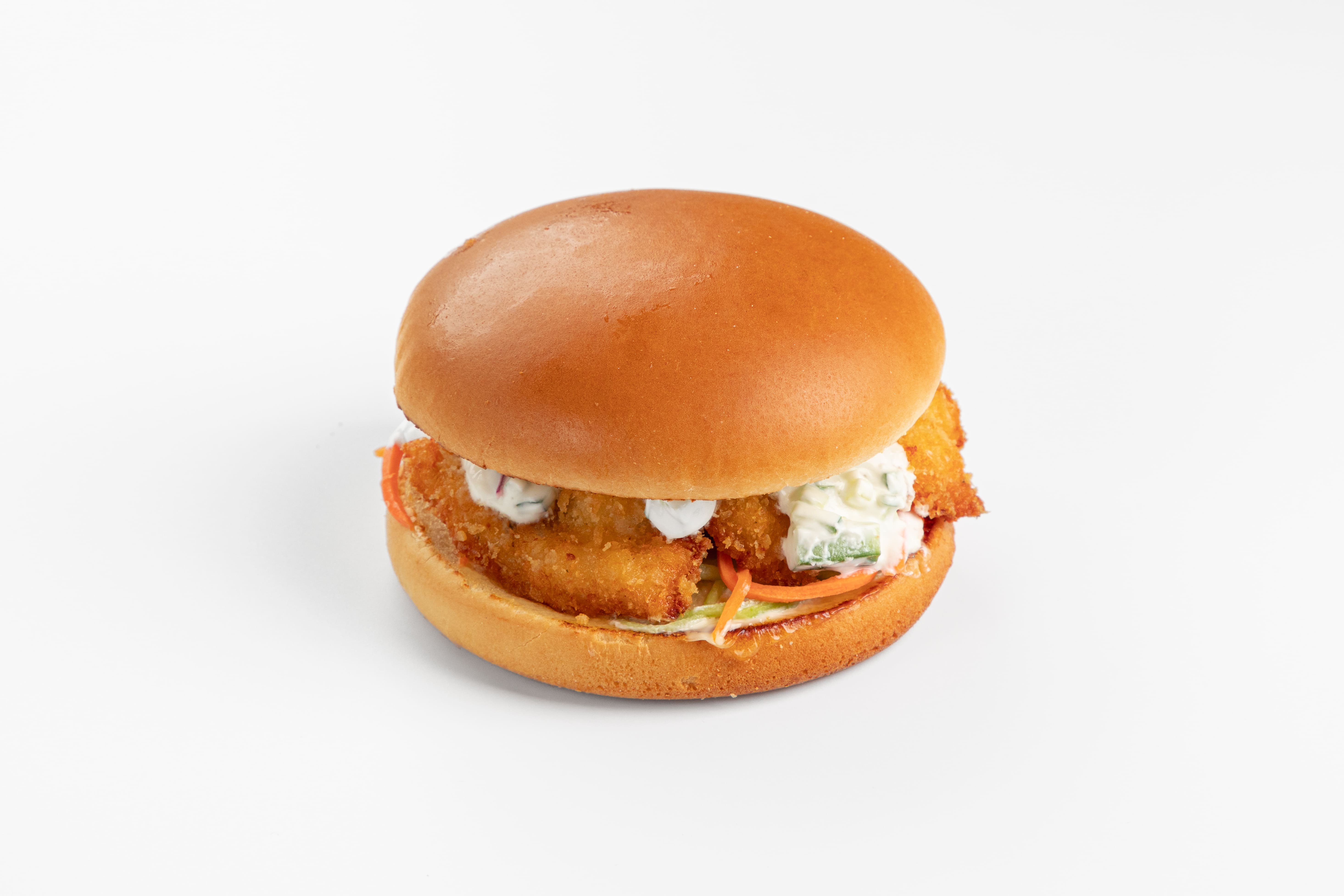 Хрустящее филе рыбы в кляре, морковь, огурцы, соус тадзики, красный лук, соус лимонный майо. Подается с картофелем фри