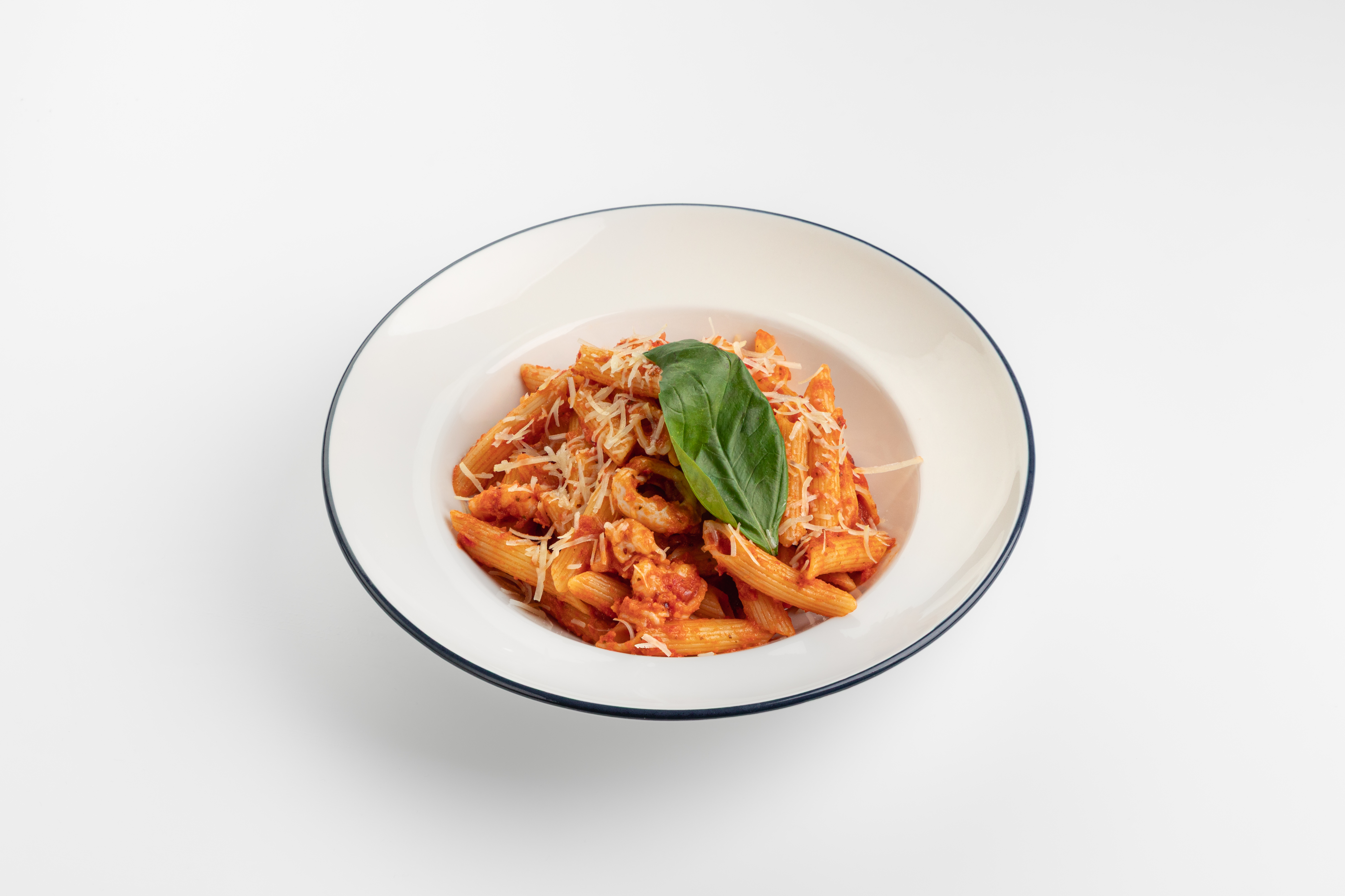 пенне, соус Аррабиата, пармезан, креветки, кальмары (острая)