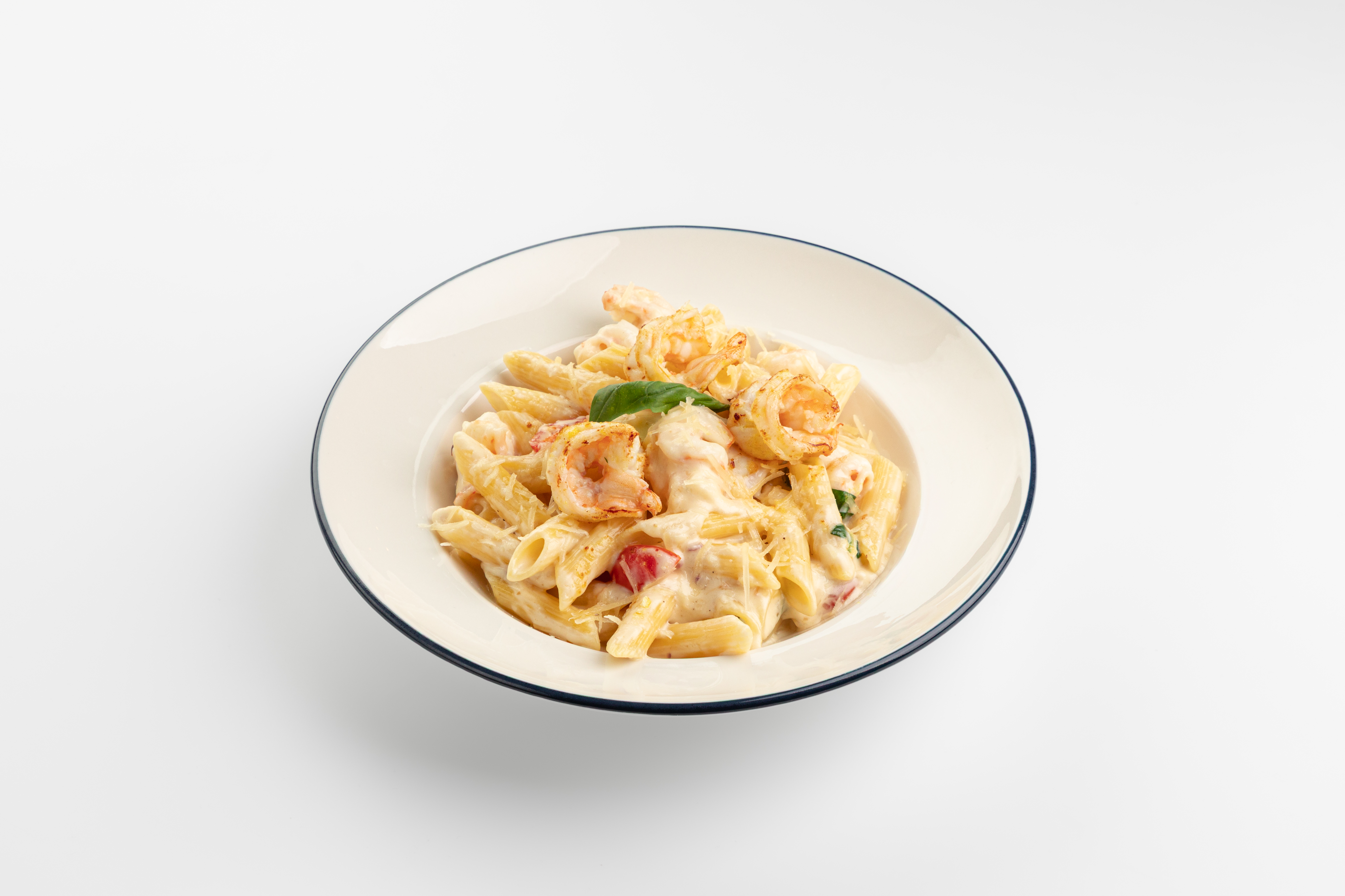пенне, лимонно-сливочный соус морне, сливки, пармезан, креветки, шпинат, томаты черри